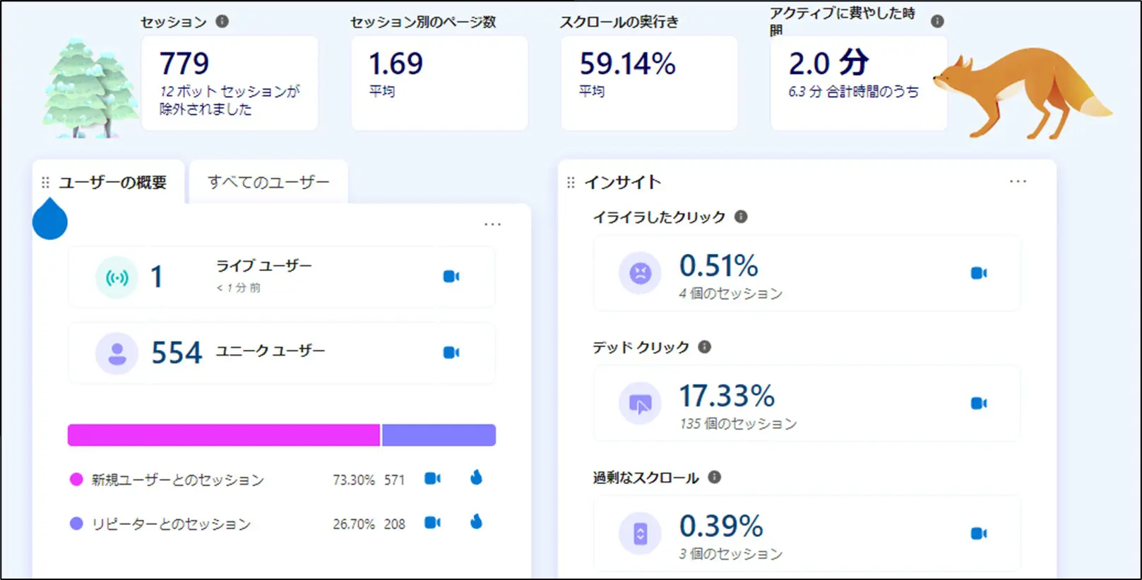 「ヒートマップClarity」でページ内分析を行うと、訪問者の行動パターンを可視化でき、どの部分が最も注目を集めているか、またどこで離脱しているかがわかります。