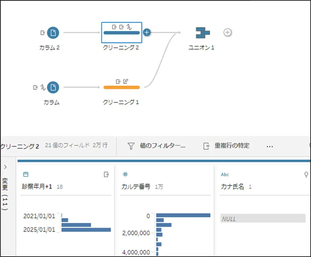 ここでTableau Prep Builderを使い、「診察年月」「診察年月+1か月」「診察年月+2か月」などの指標を作成し、ピボット機能で日付を1つに集約します。