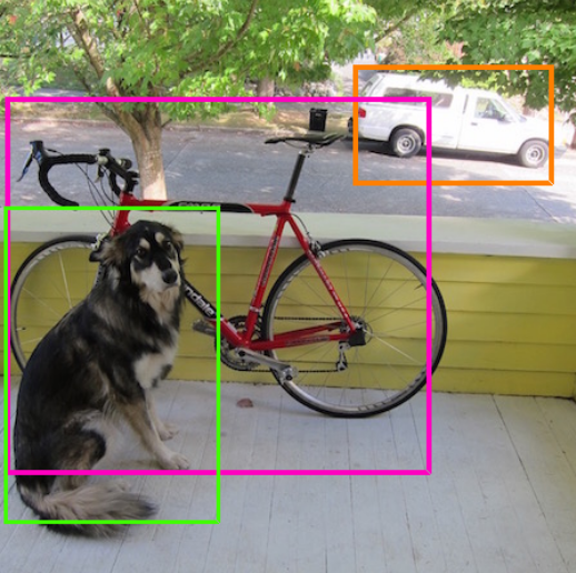 上の画像が物体検出の出力例です。枠線の色が物体の候補(犬、自転車、車)を表しています。