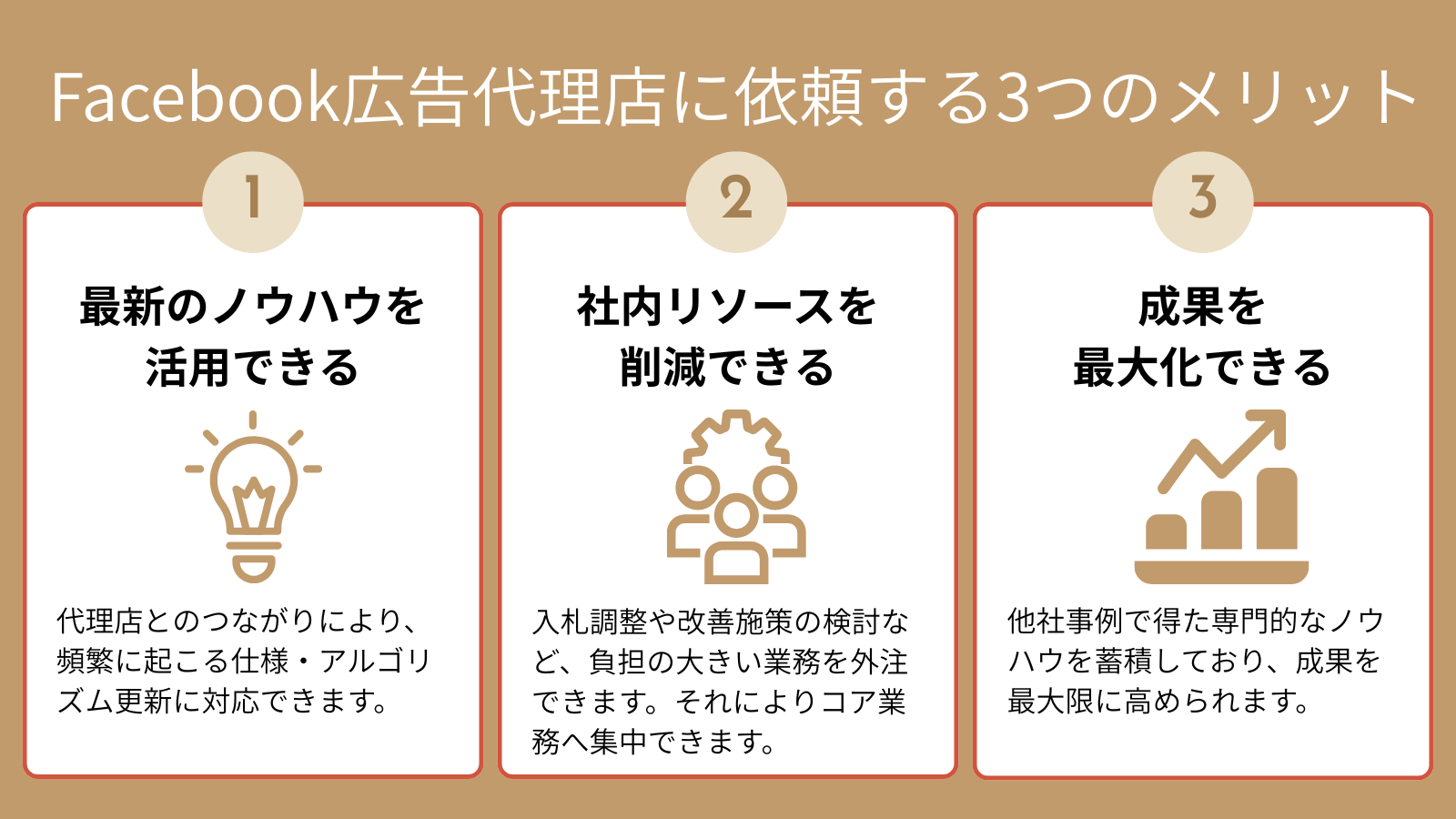 Facebook広告を効果的に運用するには、専門知識と豊富な経験を持つ代理店に依頼するのが近道です。