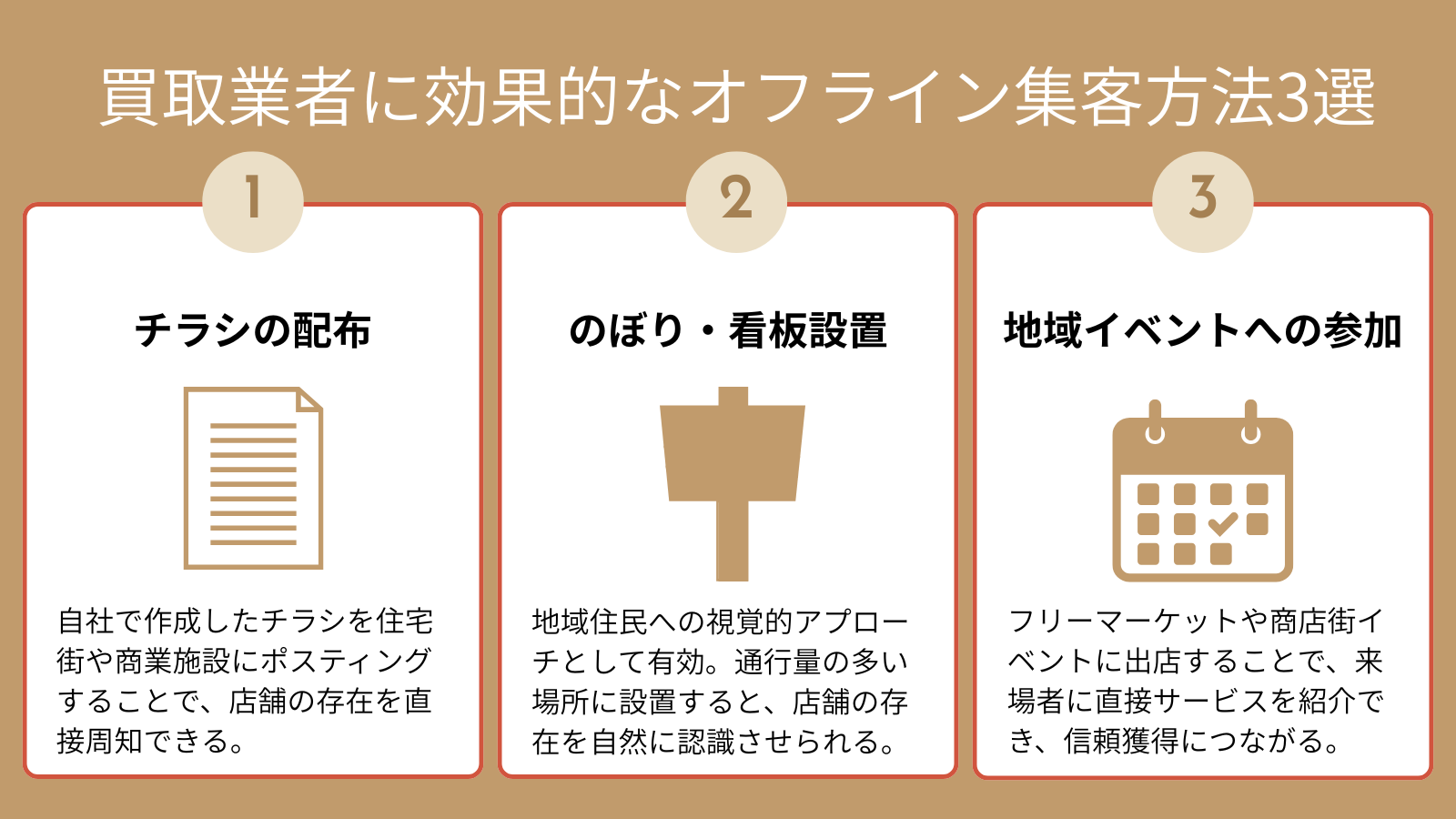 地域密着型の買取業者では、オンライン施策だけでなくオフラインでの集客活動も欠かせません。