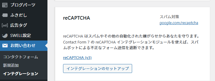 - 「reCAPTCHA」セクションの「インテグレーションのセットアップ」をクリック