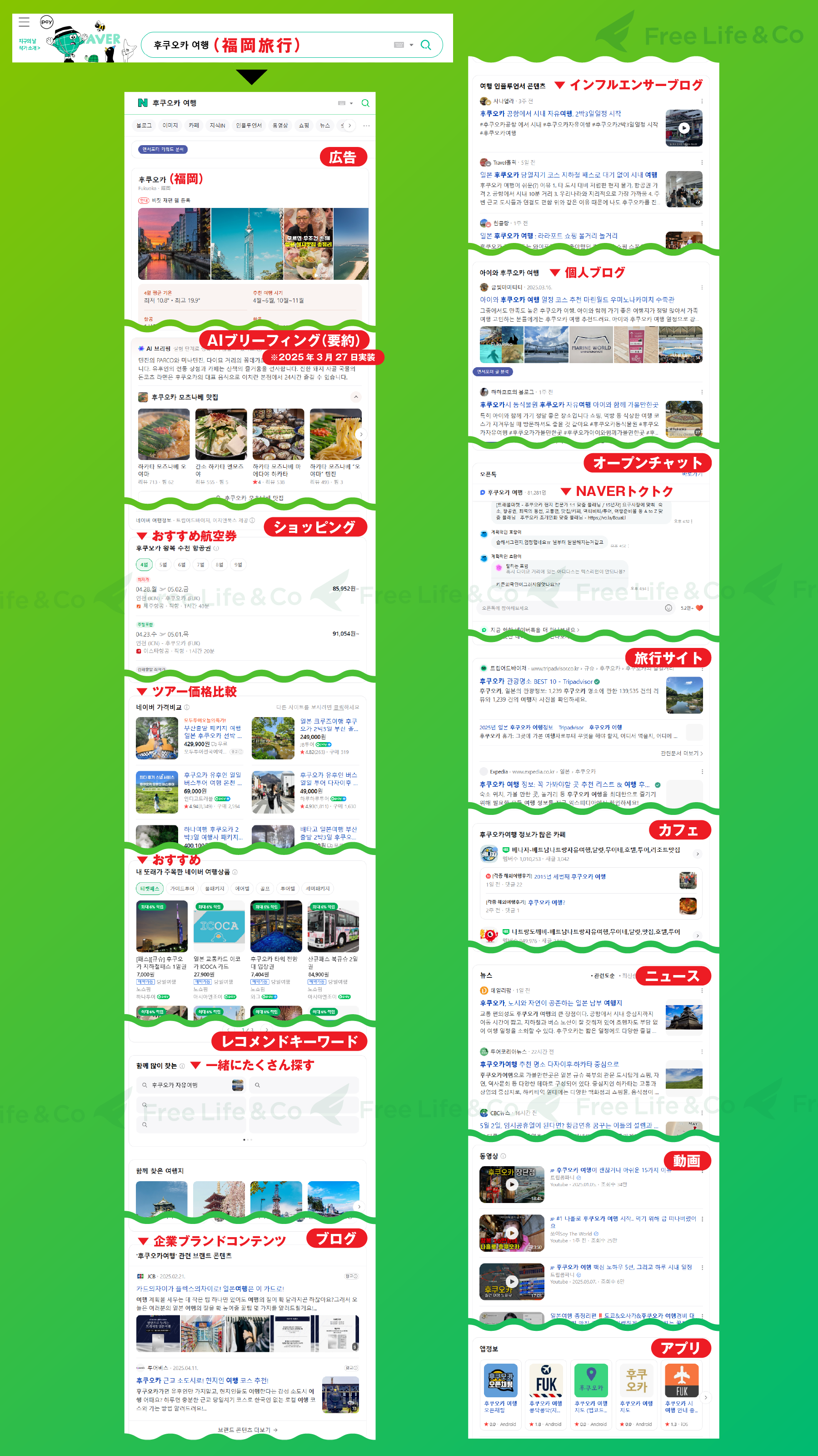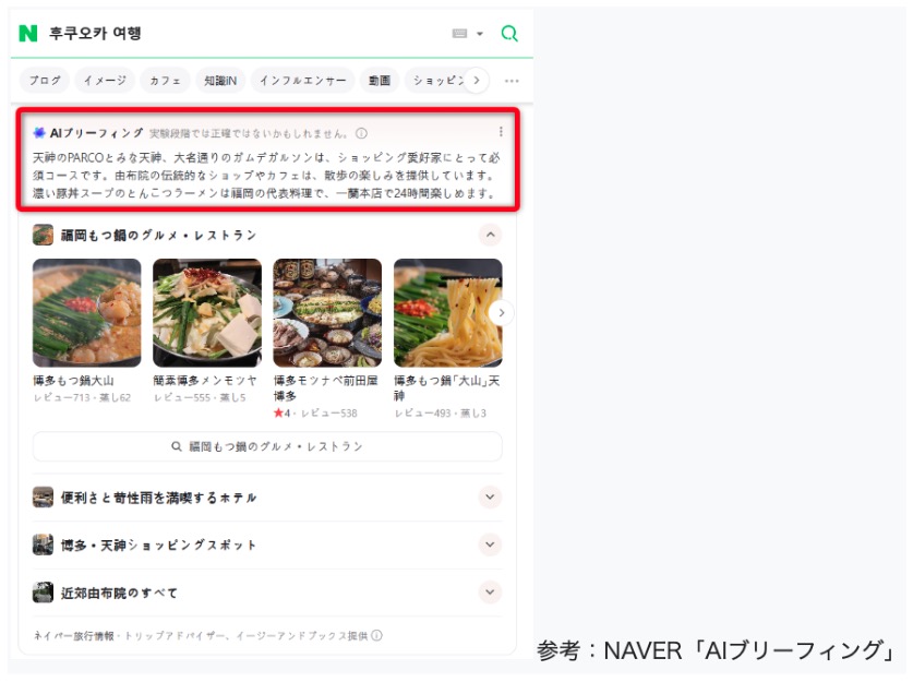 並び順: (広告)→AIブリーフィング(要約)→ショッピング(おすすめ航空券→ツアー価格比較→おすすめ)→レコメンドキーワード(一緒にたくさん探す)→ブログ(企業ブランドコンテンツ→インフルエンサー→個人)→オープンチャット(NAVERトクトク)→旅行サイト→カフェ→ニュース→動画→アプリ