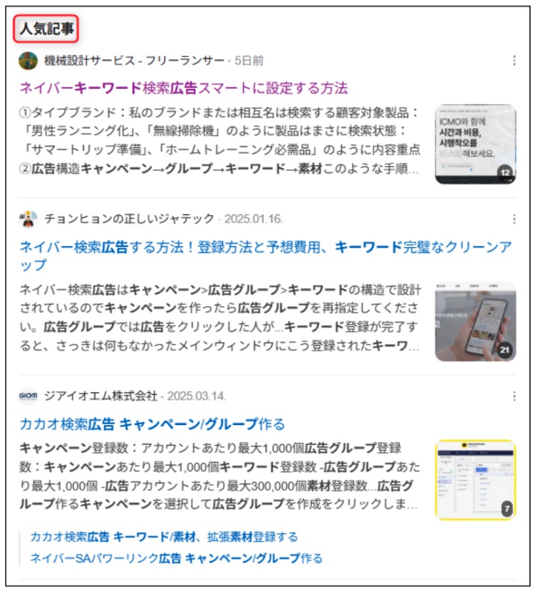 以前のNAVER形式で、トピックの分類が難しいキーワードであった場合、「人気記事」として表示されます。
