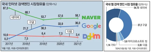 NAVERのシェアはもとの9割程度から54.26%まで減少(2024年8月7日時点)していましたが、2024年12月以降、7年ぶりに70%台まで急回復しました。