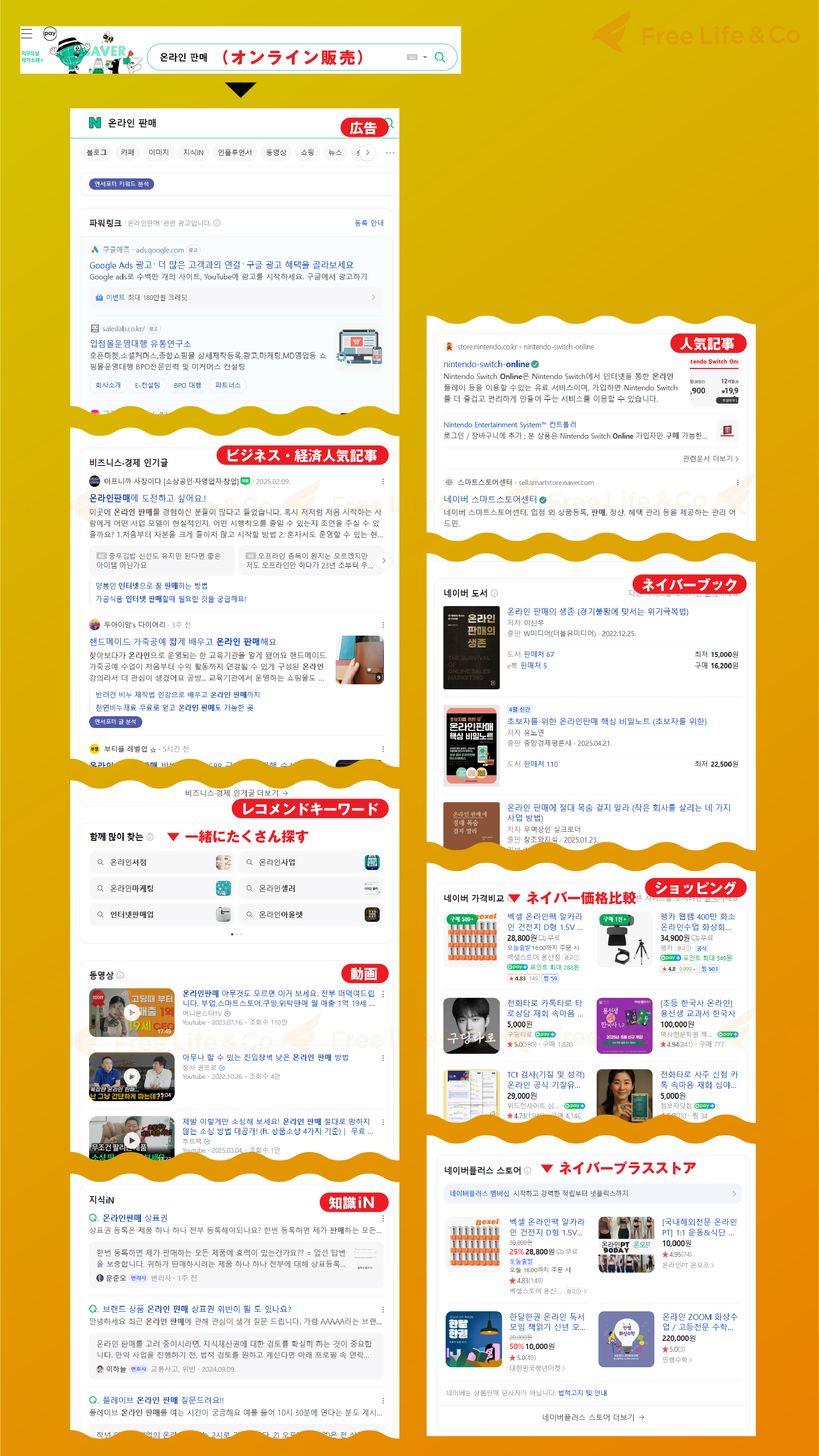 並び順:(広告)→ビジネス・経済人気記事→レコメンドキーワード(一緒にたくさん探す)→動画→知識iN→個人ブログ→ネイバーブック→ショッピング(ネイバー価格比較→ネイバープラスストア→別キーワードのおすすめコンテンツ