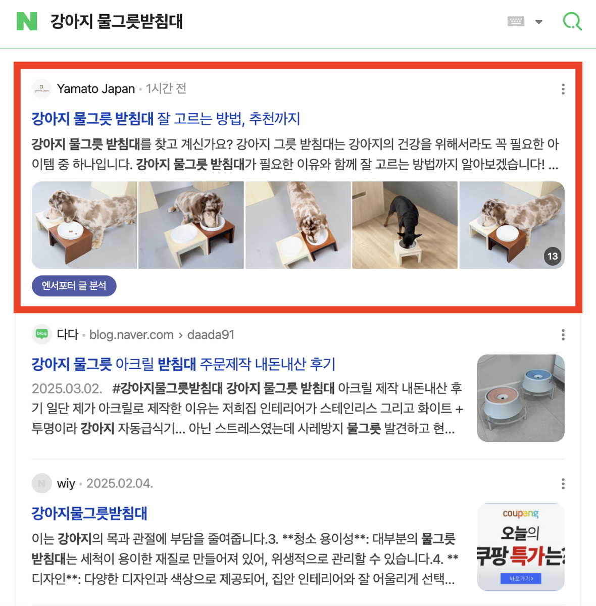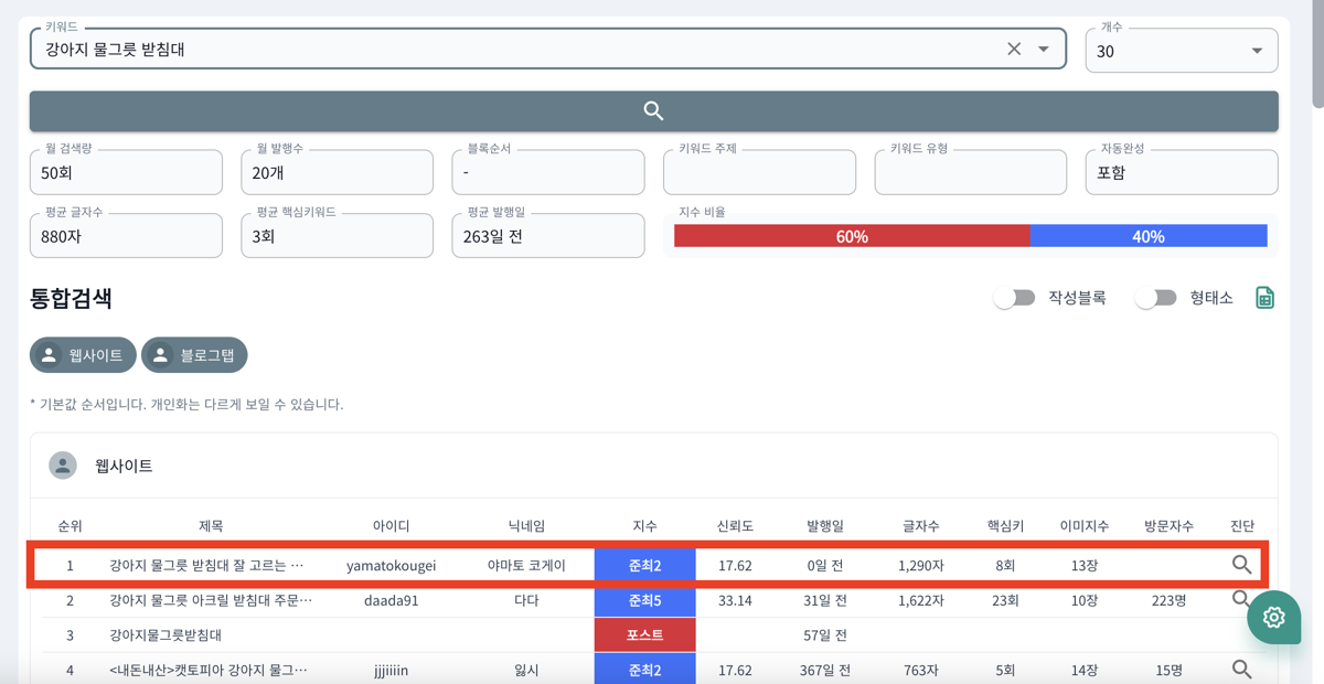 ブログは最初に始めたのブログ指数が非常に低いため、上位露出のためには小さなキーワードから少しずつターゲティングすることが重要です。