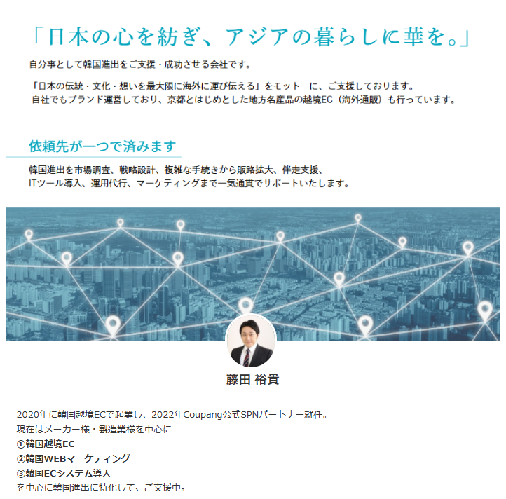 こんにちは、韓国越境EC・韓国WEBマーケティングを専門にご支援しているFree Life&Co株式会社、代表取締役の藤田裕貴です。