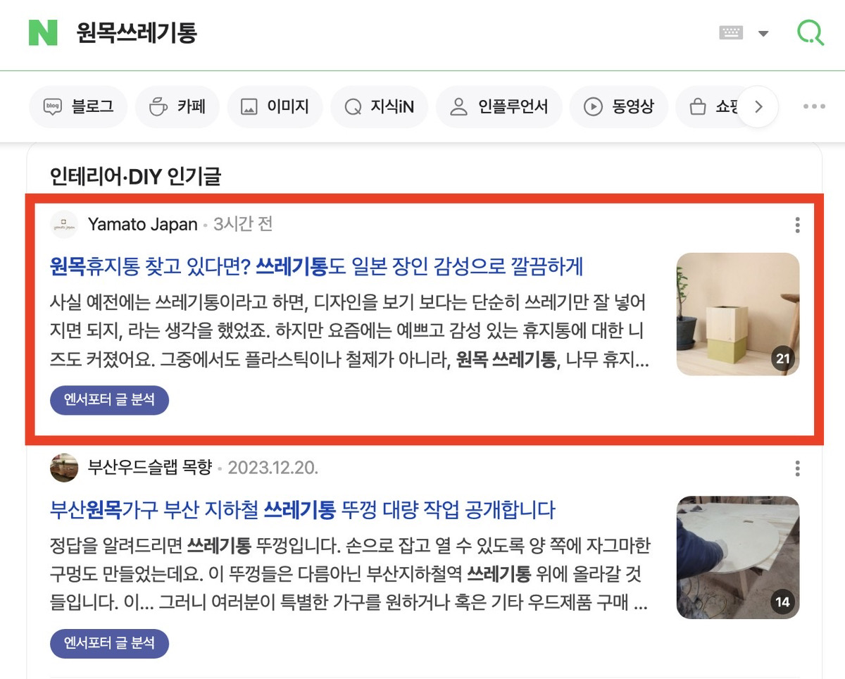 「木製ゴミ箱」[원목 휴지통] (第1検索キーワード)のキーワードを狙いながら、「木製ゴミ箱」[원목 쓰레기통](第2検索キーワード)でも、上位表示。