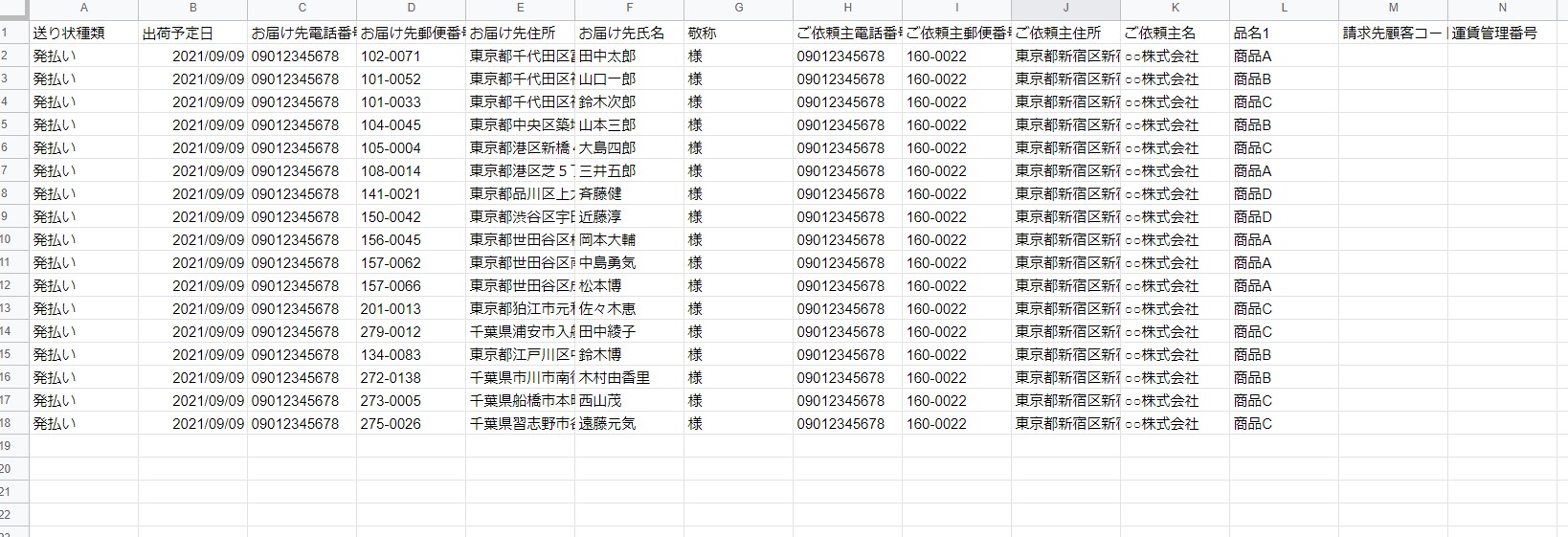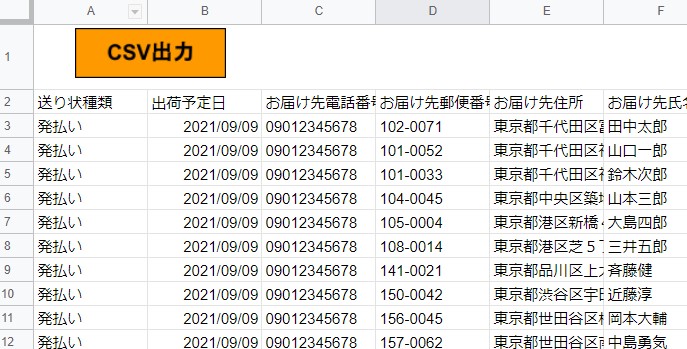 今回ヤマトのシステムはShif-JS対応なので、直接スプレッドシートからCSVをダウンロードしたものは使えず、スプレッドシートからCSV出力をする際に、Shift-JSに変換してあげる必要があります。