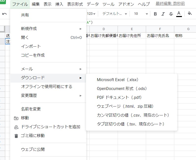 ①スプレッドシートから直接「ファイル」⇒「ダウンロード」⇒「CSV」で出力をする