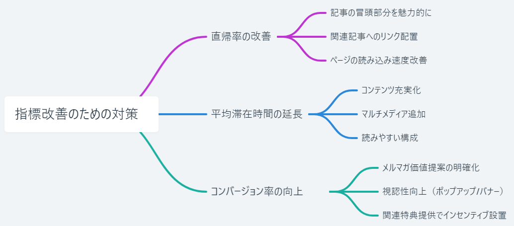 これらの対策を実施し、定期的に指標を確認しながら継続的に改善を行うことで、ブログの全体的なパフォーマンスを向上させることができます。