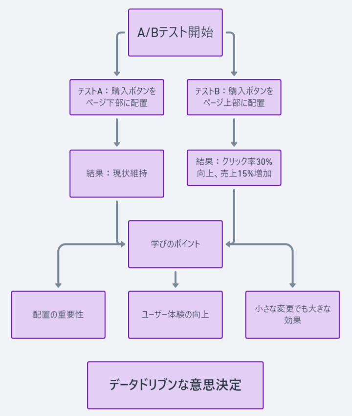 テストBで購入ボタンをページ上部に配置したところ、クリック率が30%向上し、売上が15%増加しました。