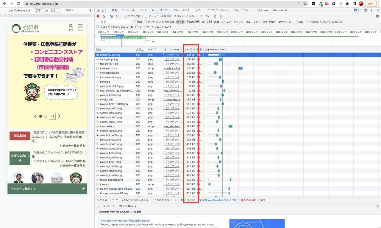 試しに、私の故郷"大阪府松原市"のオフィシャルサイトの画像群の重さを計測してみました。